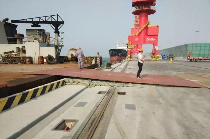 為做好首次大件設(shè)備接卸工作,集團(tuán)公司高度重視,認(rèn)真謀劃,先后召開3次裝卸流程技術(shù)調(diào)度會(huì)。結(jié)合碼頭承臺(tái)結(jié)構(gòu),積極制定船舶靠泊、護(hù)輪坎及軌道防護(hù)方案,準(zhǔn)確核算碼頭前沿承載負(fù)荷,并根據(jù)潮汐情況確定最佳的卸船時(shí)間,保證了貨物的安全接卸。