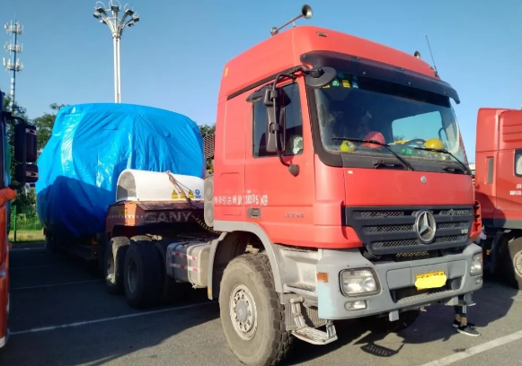 近日,商車邦在北京某地遇到了4輛大件車,一輛奔馳Actros540馬力6x6牽引車,已經(jīng)裝載了一臺風(fēng)力發(fā)電主機(jī);3輛陜汽德龍6x4牽引車,正在等待裝貨。