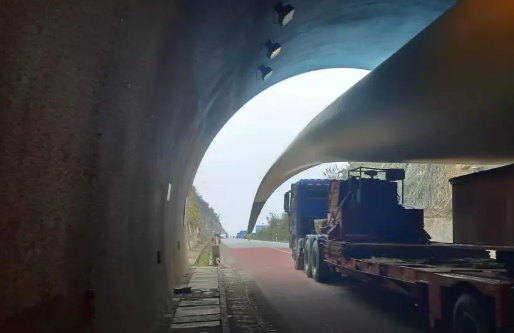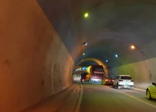 雷雨埡隧道內(nèi)大件運(yùn)輸車輛,目測(cè)距離隧道頂約1米。