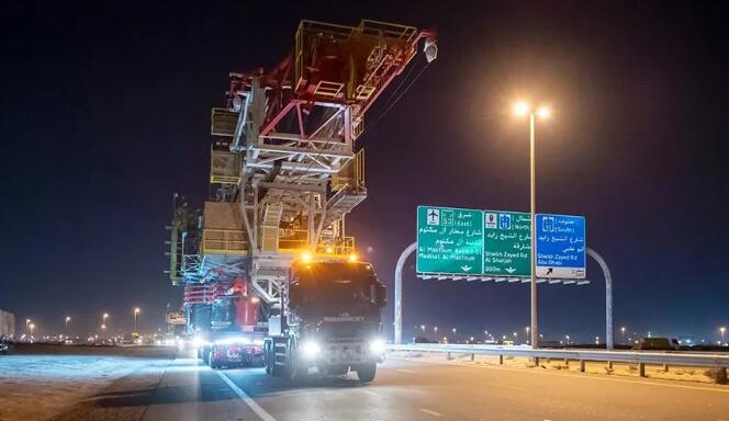運(yùn)輸前需要進(jìn)行的準(zhǔn)備工作包括對(duì)道路基礎(chǔ)設(shè)施進(jìn)行改造,臨時(shí)替換100多個(gè)路燈和交通信號(hào)燈,建造臨時(shí)橋梁以保護(hù)地下電纜和管道。每個(gè)鉆機(jī)包括三個(gè)主要部分和三個(gè)較小的部分,重量從147噸到471噸不等。它們?cè)诮茇惏⒗镒杂蓞^(qū)的制造廠用大件運(yùn)輸車運(yùn)輸至杰貝阿里港,然后在港口裝載到Mammoet駁船上,再通過(guò)水路運(yùn)輸?shù)桨⒙?。最后在杜克姆港接收并裝載進(jìn)行陸運(yùn),鉆機(jī)段被運(yùn)送到Nimr現(xiàn)場(chǎng)400公里。