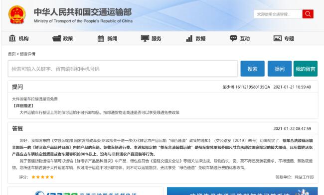 交通運(yùn)輸部官方網(wǎng)站在留言咨詢欄,對該問題進(jìn)行了答復(fù)。