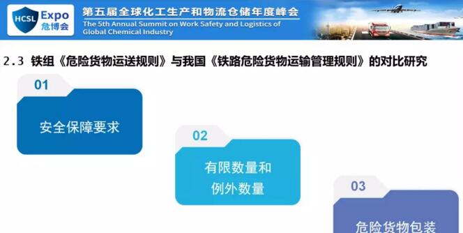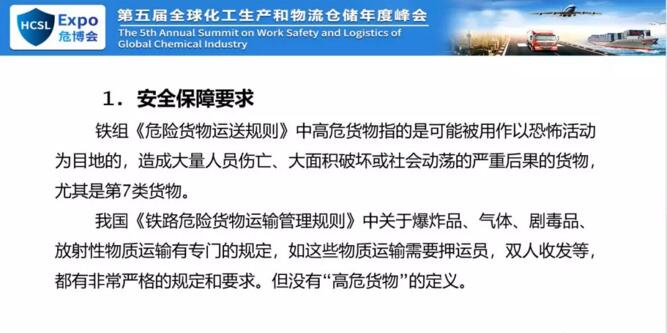 這是我們否它的主要原因,我們認為你不能大量的引用歐盟標準,你可以引用內(nèi)容,因為內(nèi)容可以直接摘過來,但是不能直接引用,直接引用我們沒法執(zhí)行,所以主要原因是在這兒。下面我說一下咱們的規(guī)則,鐵組的危險貨物規(guī)則和國家的鐵路運危險貨物運輸管理規(guī)則。一個是近期我們受到征求意見稿就是叫高危貨物或者高?;瘜W品,對我們來說高危貨物,但是鐵路的運輸規(guī)則和橘皮書里面早就有高危化學品,但是我們的域值差別很大。我國鐵路危險貨物運輸管理規(guī)則中有各種爆炸品、氣體、劇毒品、放射性物質(zhì)有專門規(guī)定,但是沒有高危貨物的定義。