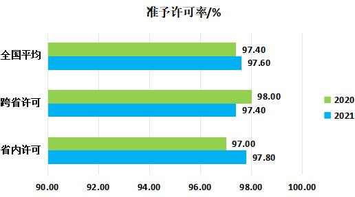 2021年全國(guó)大件運(yùn)輸許可準(zhǔn)予許可率達(dá)97.6%,較2020年提高0.2個(gè)百分點(diǎn)。